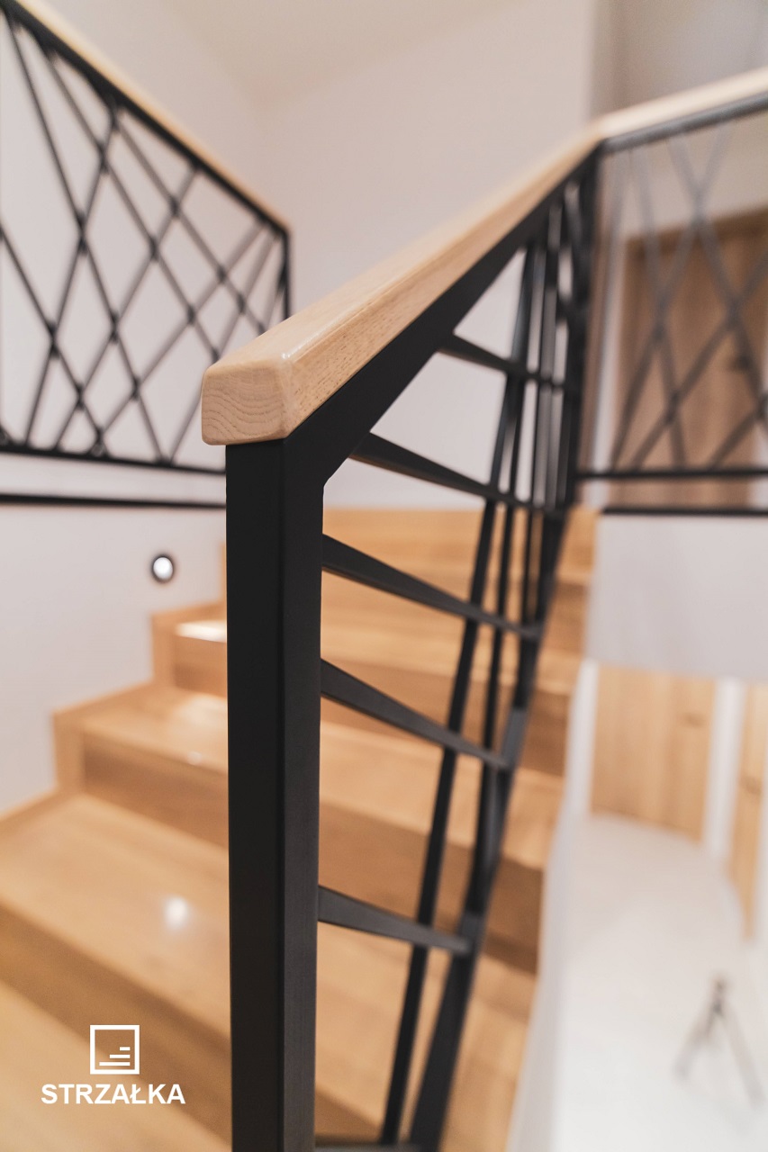 Balustrada metalowa, stworzona z niezwykłą precyzją metaloplastyki i malowania proszkowego, harmonijnie łączy się z drewnianym pochwytem. Ten detal doskonale pasuje do kolorystyki schodów, tworząc spójną i elegancką całość.